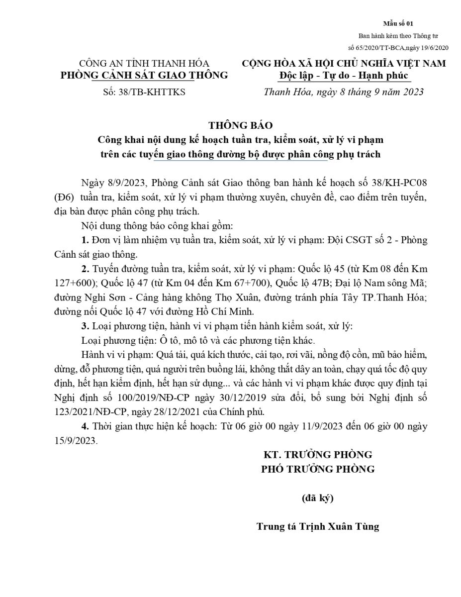 Thông báo công khai nội dung Kế hoạch Tuần tra kiểm soát trên tuyến của Đội CSGT số 2, Phòng PC08 (từ ngày 11/9/2023 đến ngày 15/9/2023)
