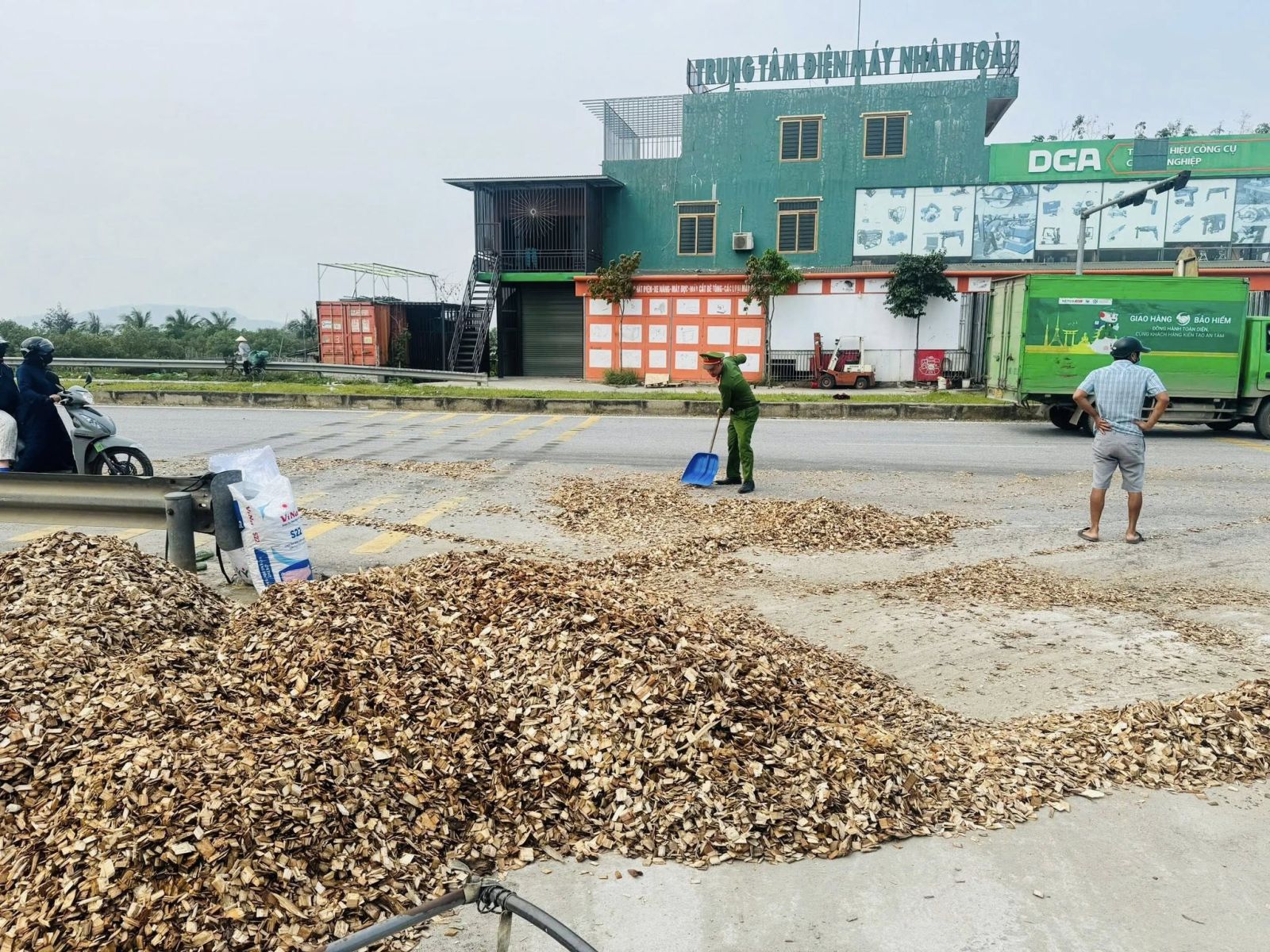 Đại uý Lê Xuân Hải cùng người dân xung quanh thu gom dăm gỗ, bảo đảm an toàn giao thông cho người đi đường